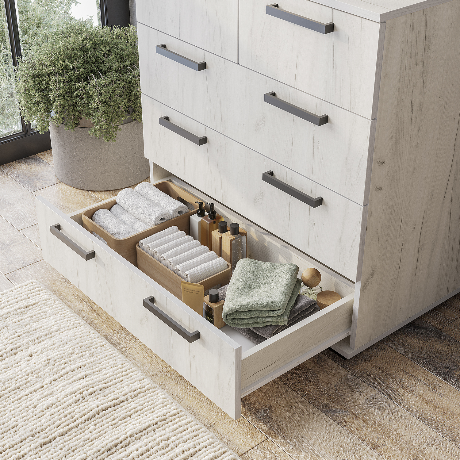 · 5 просторных ящиков (на роликовых направляющих 400 мм) с нагрузкой до 5 кг каждый — для белья, одежды и документов.