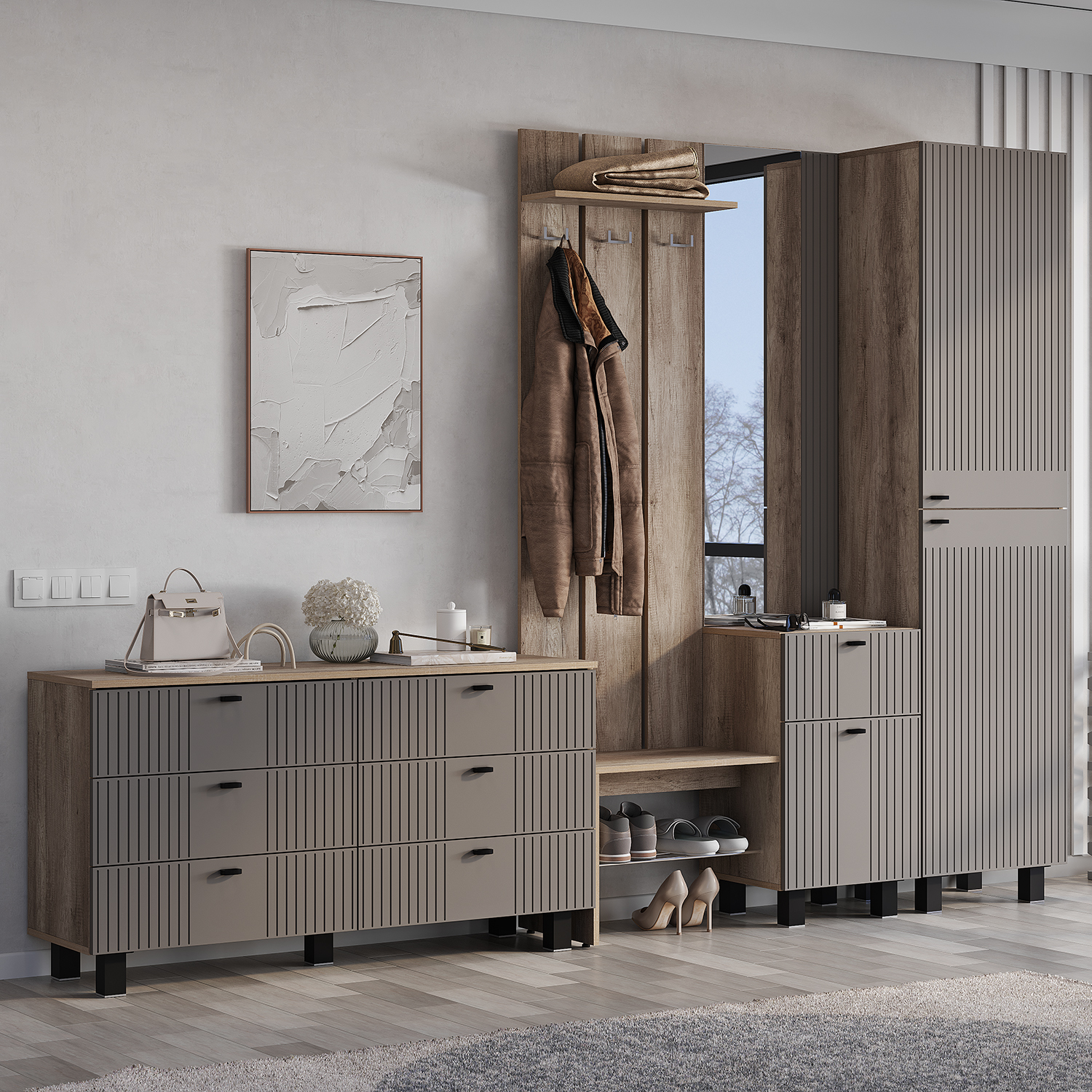 · Дизайн: Матовые фасады МДФ цвета «муссон софт» с текстурной фрезеровкой, черные металлические ручки (32 мм).