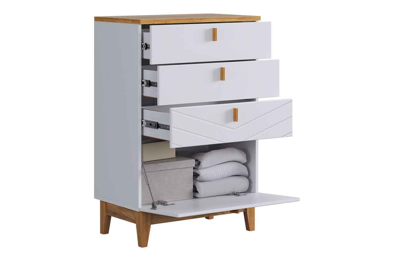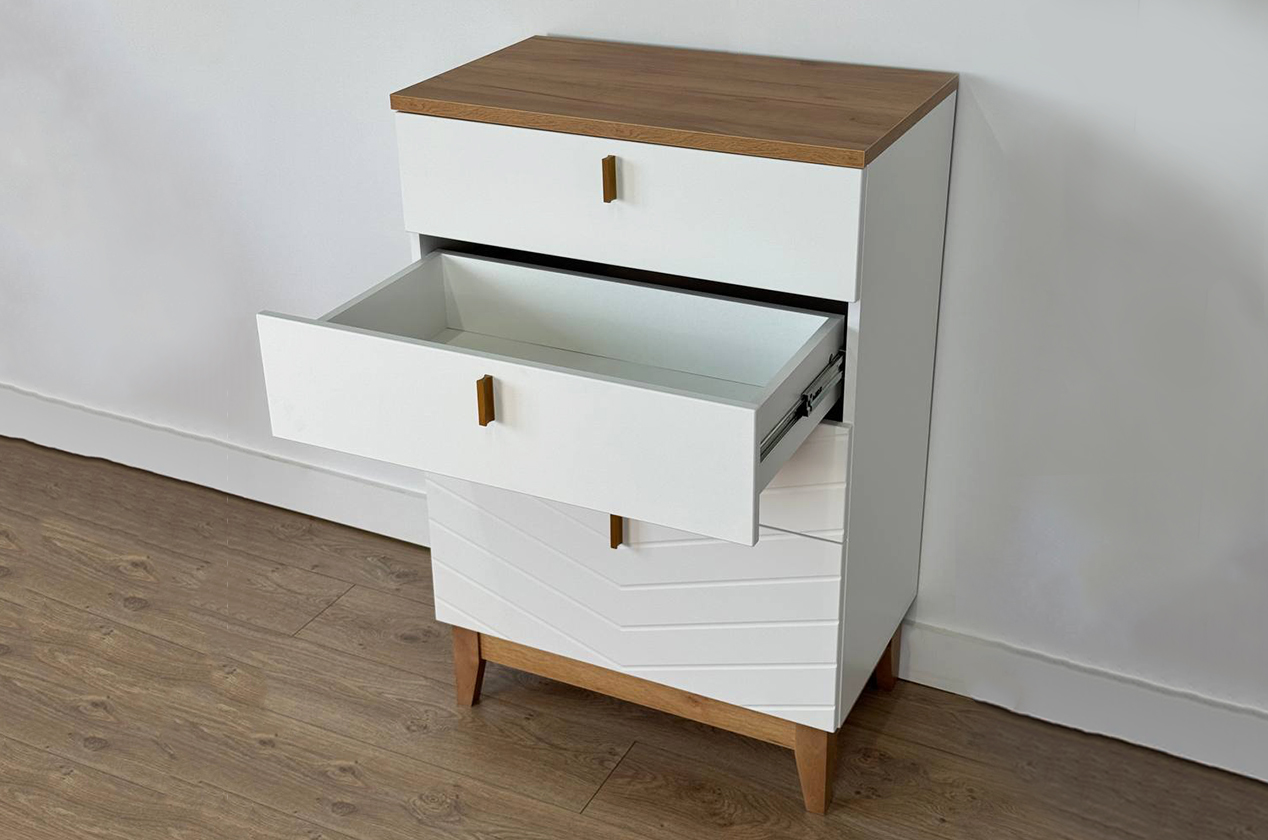 Комод сочетает в себе лаконичный скандинавский дизайн и многоуровневую систему хранения. Благодаря комбинации выкатных ящиков и скрытого отсека он помогает организовать хранение самых разных вещей, поддерживая порядок и эстетику в спальне, гостиной или прихожей.