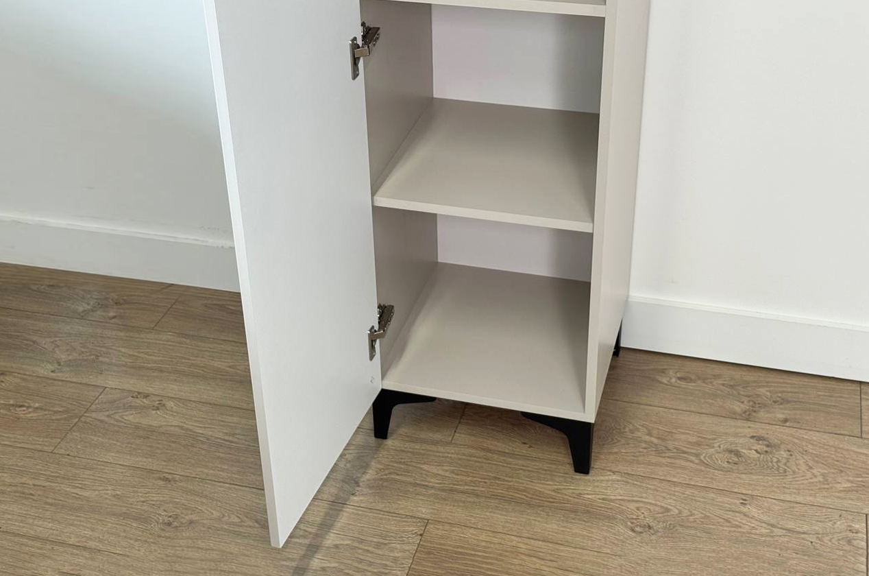 • • Стильный дизайн: Элегантный фасад из МДФ с декоративной фрезеровкой и надёжная металлическая ручка.
