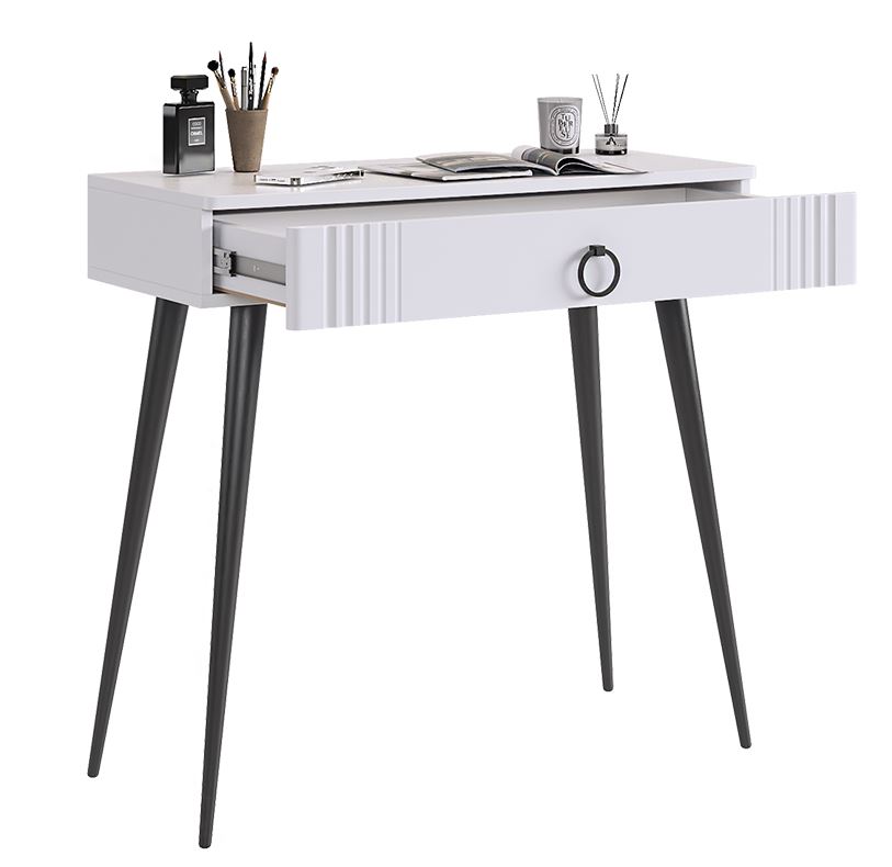 Контрастные оттенки, используемые в оформлении стола, делают его универсальным решением для различных стилей интерьера. Белый цвет фасадов и темные элементы, такие как металлическая фурнитура, добавляют строгости и четкости, что позволяет легко интегрировать этот предмет мебели в любой декор — будь то минимализм, скандинавский стиль или классика.